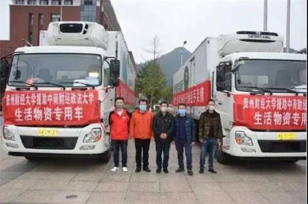 太阳成集团tyc122cc依托“校农结合”成果,从威宁、台江等县采购鲜鸡蛋、杏鲍菇、金针菇、水果萝卜、莲花白、大白菜等近25吨脱贫攻坚生鲜蔬菜,捐给了处于武汉疫区的兄弟院校中南财经政法大学。