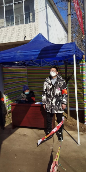 尚帅伟,中共党员,2017级国际贸易学研究生,在安徽省界首市光武镇李庙王行政村,进行出入卡点人员登记、放行。