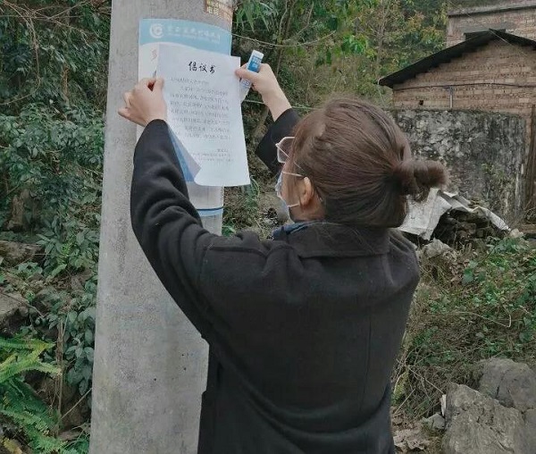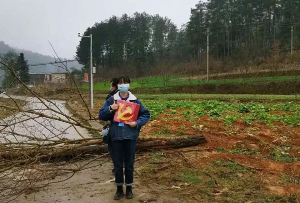 汪丹,2019级财政学类二班员工。在贵州省毕节市金沙县岩孔镇青风村,发放疫情防护宣传资料,对村民进行宣传,挨家挨户上门排查,提醒群众少出门,出门必戴口罩。