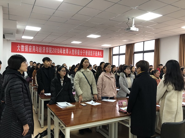 在激情飞扬的国歌声中,2019秋季入党积极分子培训班开班典礼拉开帷幕。此次参加培训的学员共90人,其中有6名学员来自大数据统计公司,这是加强院系协同共建,促进党建工作全面纵深发展,增进两院学习交流的良好机会。首先,徐梅书记致词,她希望全体入党积极分子在党校培训的课堂上学好党的理论知识,并且在今后的学习和实践中以实际行动积极地向党组织靠拢,争取早日加入党组织。接着,向岚副书记为大家宣读党校守则。开班典礼结束后,公司特邀组织员秦立俊老师为同学们开始党课学习第一课——《坚定理想信念,永远跟党走》。秦老师结合自身亲身经历告诉同学们坚定党的理想信念是党领导中国人民走到今天的不竭动力,同时,想要成为一名合格的共产党员,首先要端正入党动机,熟悉入党流程,坚定党的理想信念,永远跟党走。