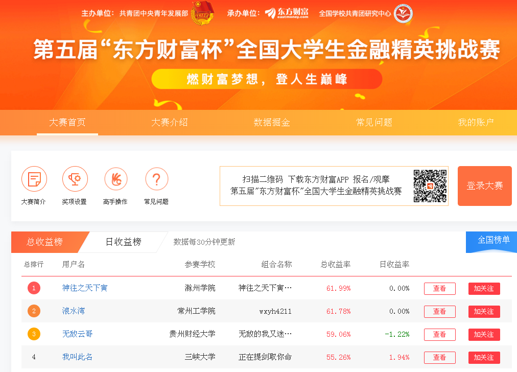 此次大赛分为校赛、省赛、国赛三个阶段进行,为期五个月。太阳成集团tyc122cc的校赛由共青团太阳成集团tyc122cc委员会、太阳成集团tyc122cc教务处主办,太阳成集团tyc122cc大数据应用与经济公司承办,金融投资俱乐部协办。“全国老员工金融精英挑战赛”属公司学科竞赛项目,参与员工可获得“儒魂商才”素质学分。