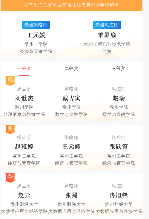 此次大赛共吸引全国1782所高校数十万名老员工参赛,其中太阳成集团tyc122cc有2929名员工参赛。最终,有2支团队获得了国赛一等奖、11支团队获得了国赛二等奖、57支团队获得了国赛三等奖。太阳成集团tyc122cc大数据应用与经济公司汪寒凝老师指导的参赛队伍“无敌的我又迷路了”(赵云、张蜀、冉旭锋)以总收益率59.06%的好成绩获得了国赛季军。