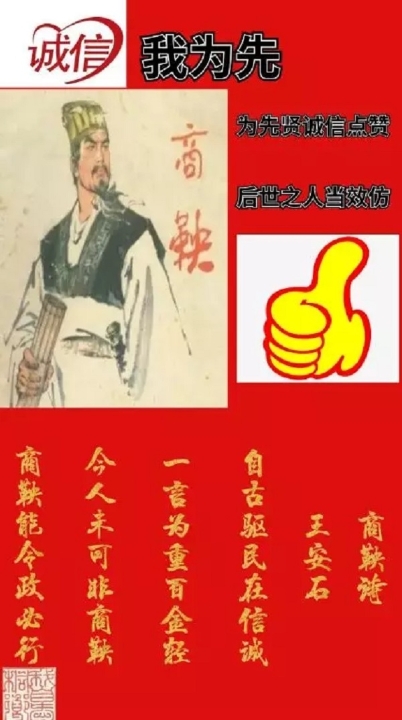 我们的设计主要灵感来源于这首来来自北宋著名诗人王安石先生所作的商鞅诗,申述以诚取信于民的为政之道。我们要坚持传承中国优秀的传统文化——诚信。此诗说明了从古以来统治人民在于信诚,一言为重百金为轻立法严明。现今的儒士不可任意诋毁商鞅,商鞅能使法令政策坚决施行。商鞅在开始实行变法时,为了取得老百姓的信任和支持,商鞅采取措施,先“立木”取信于民,以严明法令。自古驱民在信诚,一言为重百金轻”二句,对商鞅令出必行的做法给予高度的赞扬。诚信在古代就已经被推行为一种优良传统品质,得到古人们的认可和赞美,而当今社会,我们更需要诚信待人接物,尤其是我们青年的诚信品质培养从此刻做起。